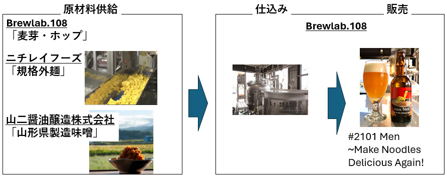 今回の商品は、生産過程で発生してしまう「規格外麺」に新たな価値を与え、食品ロスの削減に貢献します。ビールの風味を引き立てるため山形県産大豆のみそを加え、天童市のクラフトビール醸造所に協力いただき、山形の地場を活用したアップサイクル商品として誕生しました。