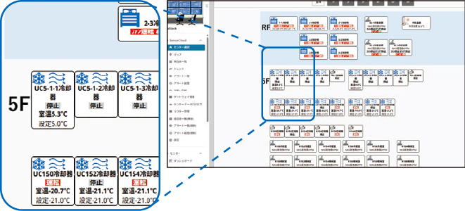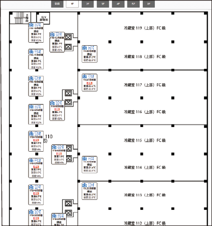さらに、冷凍機には表示物がつけられていないため、場所の把握や冷却器Aと冷却器Bがつながっているなどの仕様の特定に時間を要する場合もありましたが、遠隔監視システムには設置場所や仕様の情報も搭載し、情報を可視化させました。これにより、倉庫間の比較や分析が容易になり、次の低温施設の設計時に知見を活かすなどの改善につながっています。