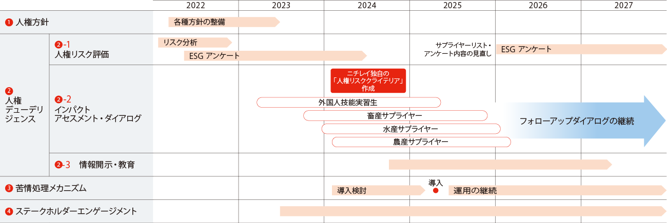 ニチレイグループでは、研究開発、調達から、商品・サービスの提供に至るまでの事業活動が、潜在的あるいは実際に人権への影響を及ぼす可能性があることを理解し、「ビジネスと人権に関する国連指導原則」に従って、ニチレイグループの事業活動に関係する人権への負の影響を特定、予防、軽減するためにデューデリジェンスを実施しています。