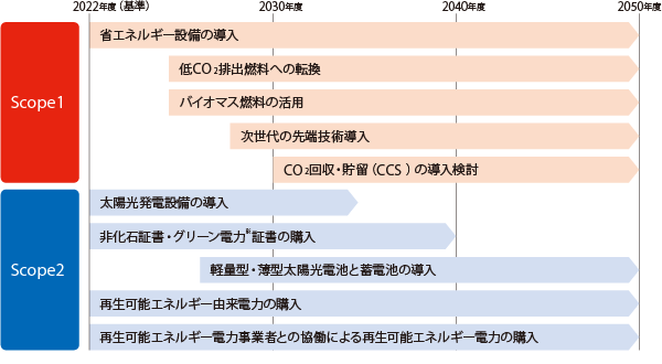 カーボンニュートラル宣言の達成に向け、ニチレイグループではロードマップを策定しました。今後は従来の削減方法に加え手法の多様化を図りながら、より着実に排出量の削減を進め実質0を目指します。