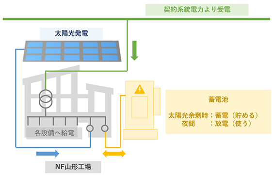 その課題解決のため、株式会社ニチレイフーズ 山形工場に、ニチレイグループとして初めて蓄電池システムを導入しました。これにより、日中に発電した電力の余剰分を貯めておき、夜間電力として使用することができるようになります。当該工場では、従来80%程度に留まっていた自家消費率を95%程度まで高めることが可能となりました。